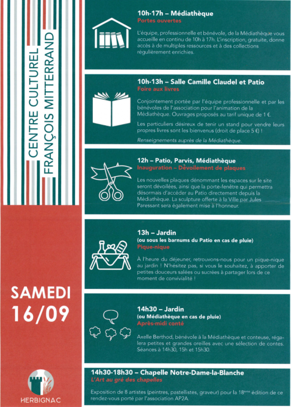 10h-17h - Médiathèque - Porte ouverte - L'équipe, professionnelle et bénévole, de la Médiathèque vous accueille en continu de 10h à 17h. L'inscription , gratuite, donne accès à de multiples ressources et à des collections régulièrement enrichies. 10h-13h - Salle Camille Claudel et Patio - Foire aux livres - Conjointement portée par l'équipe professionnelle et par les bénévoles de l'association pour l'animation de la Médiathèque. Ouvrages proposés au tarif unique de 1€. Les particuliers désireux de tenir un stand pour vendre leurs propres livres sont les bienvenus (doit de place 5€). 12h - Patio - Parvis, Médiathèque - Inauguration et dévoilement de plaques. 13h - Jardin (ou sous les barnums du Patio en cas de pluie) - Pique-nique 14h30 - Jardin - Après-midi conté - Axelle Berthod, bénévole à la Médiathèque et conteuse, régalera petites et grandes oreilles avec une sélection de contes. Séance à 14h30, 15h et 15h30. 14h30-18h30 -Chapelle Notre-Dame-la-Blanche - L'Art au gré des chapelles